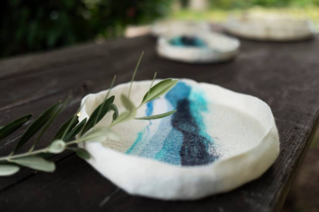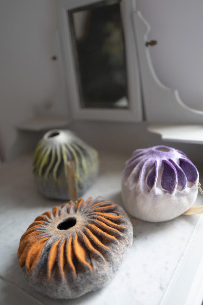 Diplômée de l’Ecole Supérieure d’Arts Appliqués Duperré à Paris, dans l’aménagement d’espaces extérieurs , j’ai toujours été passionnée par le textile. Que ce soit les impressions, les couleurs, les matières et les textures, cela a été une source d’inspiration constante. Ayant une pratique personnelle picturale, j’ai sans cesse essayé de rechercher la fibre dans mon travail de peintre. J’ai découvert le feutre lors d’une formation personnelle au Musée des Chapeaux de Chazelle sur Lyon. Cela a été un coup de foudre ! j’ai enfin pu peindre avec le textile. Par la suite, je me suis formée au centre spécialisé de laine LAINAMAC dans la Creuse et par des feutrières à la renommée internationale, où j’ai pu perfectionner et mettre au point mon univers.