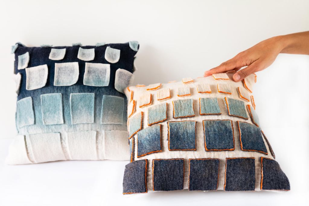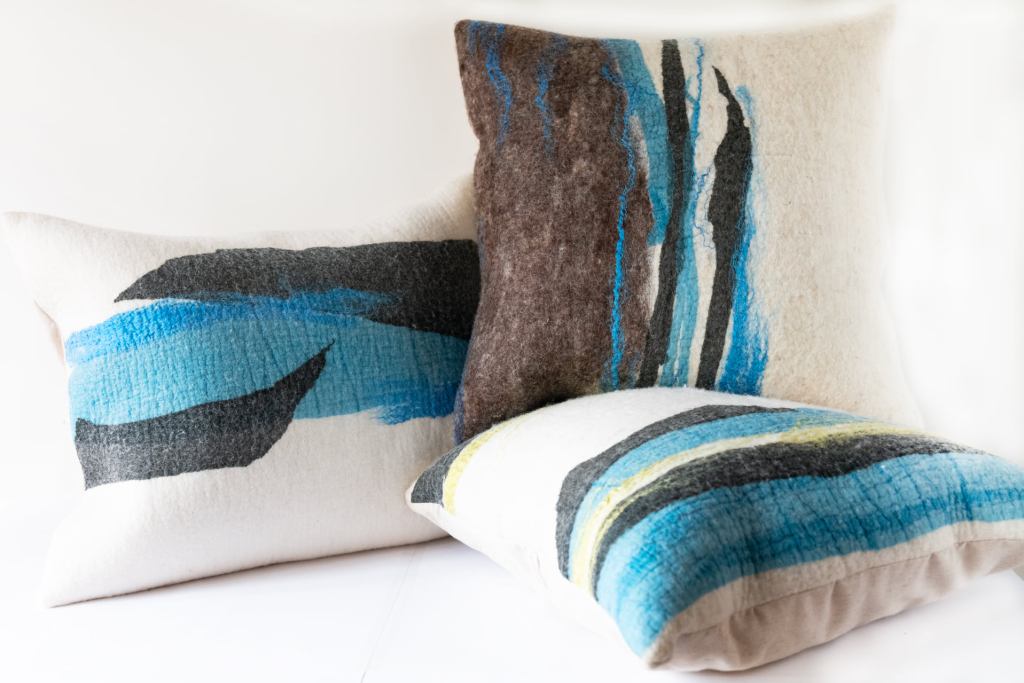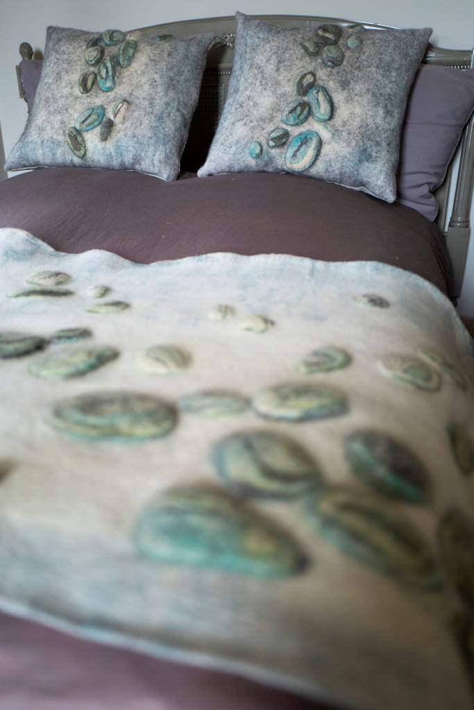 Je travaille des laines locales et choisis soigneusement les fibres en adéquation avec le projet envisagé. Les objets textiles que je confectionne sont élaborés pour habiller l’habitat, plaids, coussins, tentures murales… Je travaille sur mesure ou sur commande, j’apporte ainsi une réalisation personnalisée pour conférer à l’espace intérieur un confort sain, unique et original.