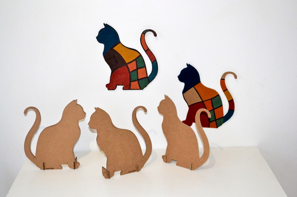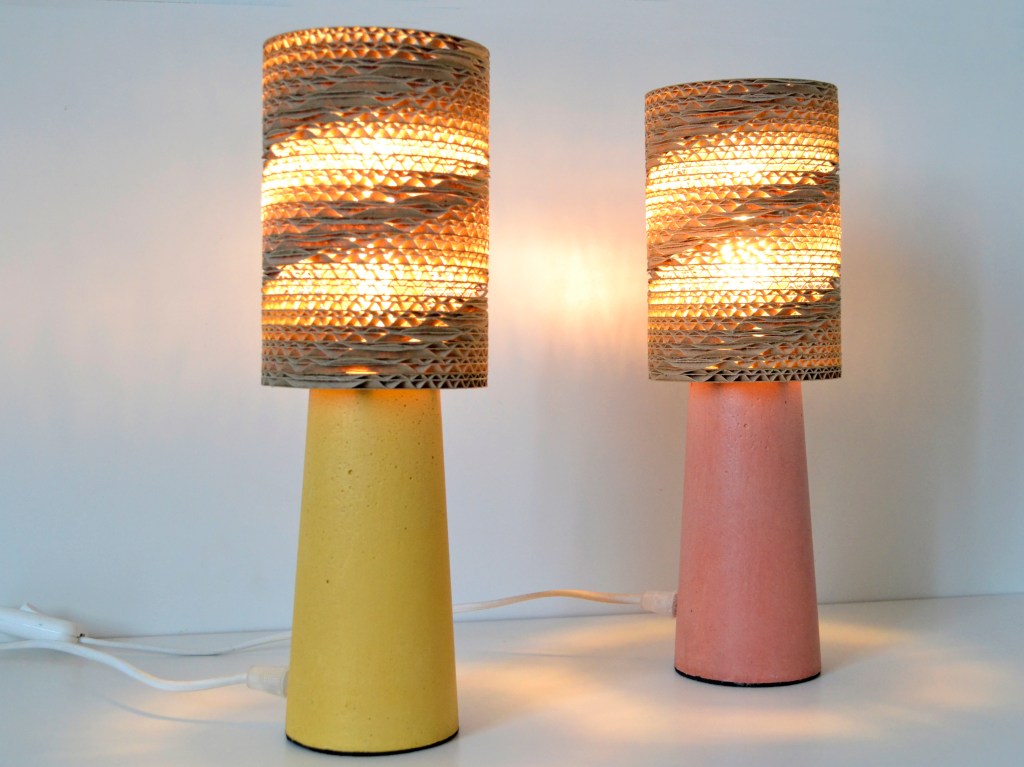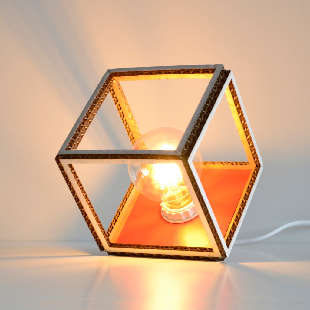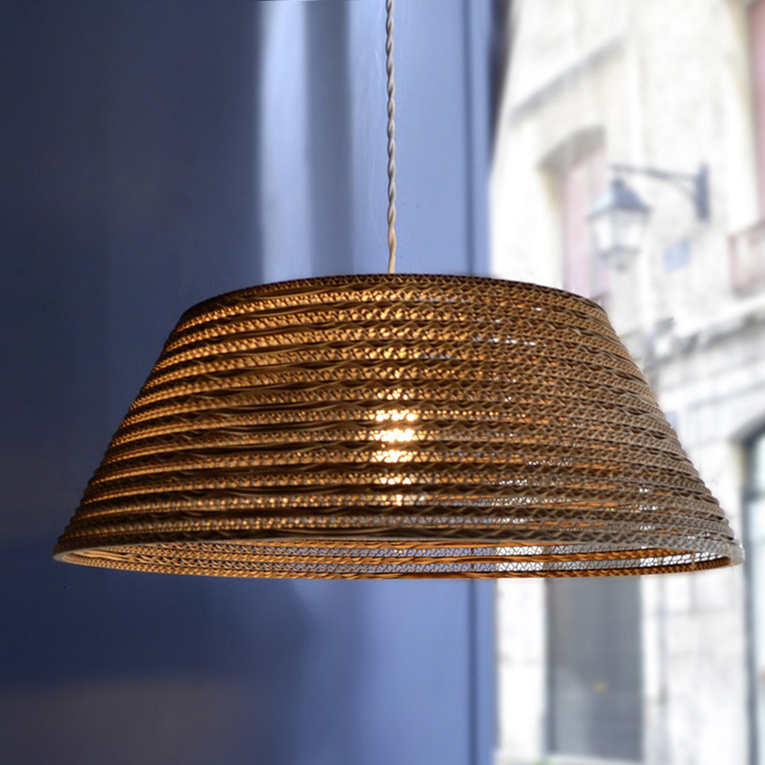 Mes objets sont découpés à la main, à la scie ou au laser et puis assemblés ou collés par mes soins. Des formes géométriques épurées, intemporelles avec quelques touches de couleur qui mettent en valeur le côté chaleureux du carton. Tout est recyclé et recyclable, local et sans produits toxiques. Pour tous les objets l’impact environnemental est minimum pendant tout le cycle de vie. Les premières créations réalisées sont des suspensions auxquelles ont fait suite à des lampes à poser.