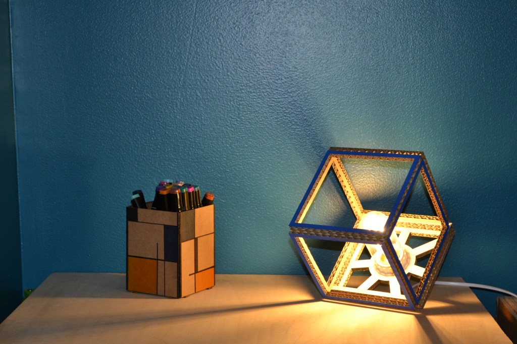 Petites porte-crayons ou porte-objets, de table, réalisés en carton compact, entièrement décorés à la main (feutres).