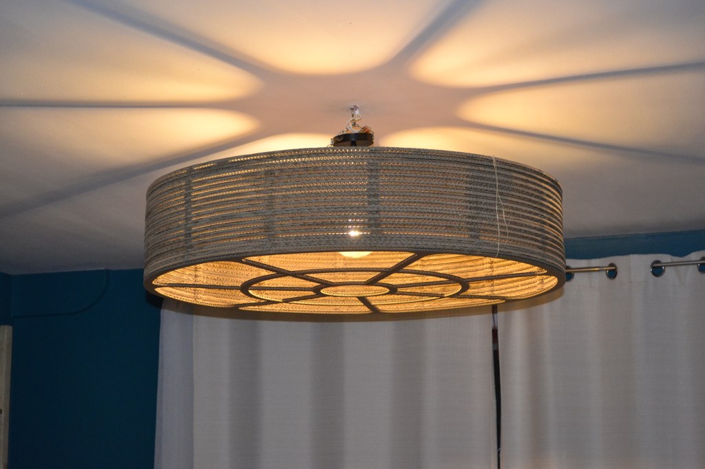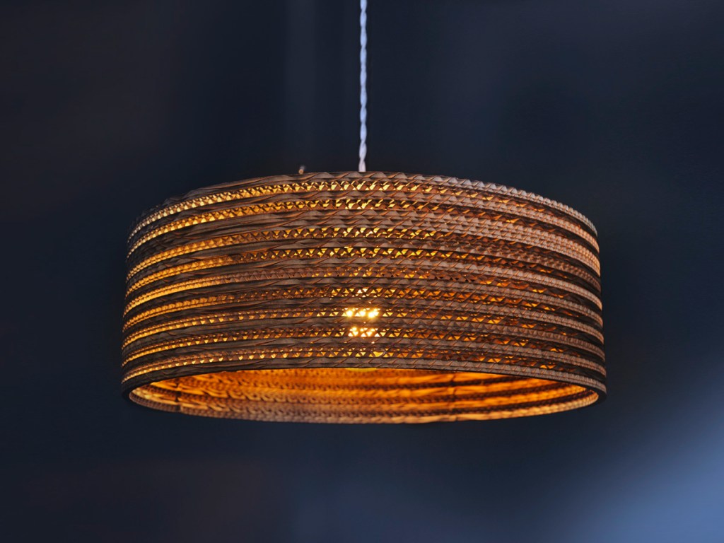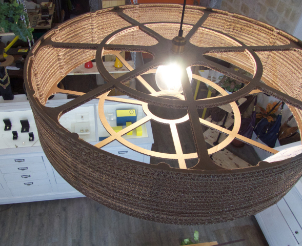 Suspension de forme cylindrique disponible en 3 taille: ~30 cm , ~40 cm, ~ 50 cm; peut être coloré ou couleur kraft; cable et douille interchangeables.