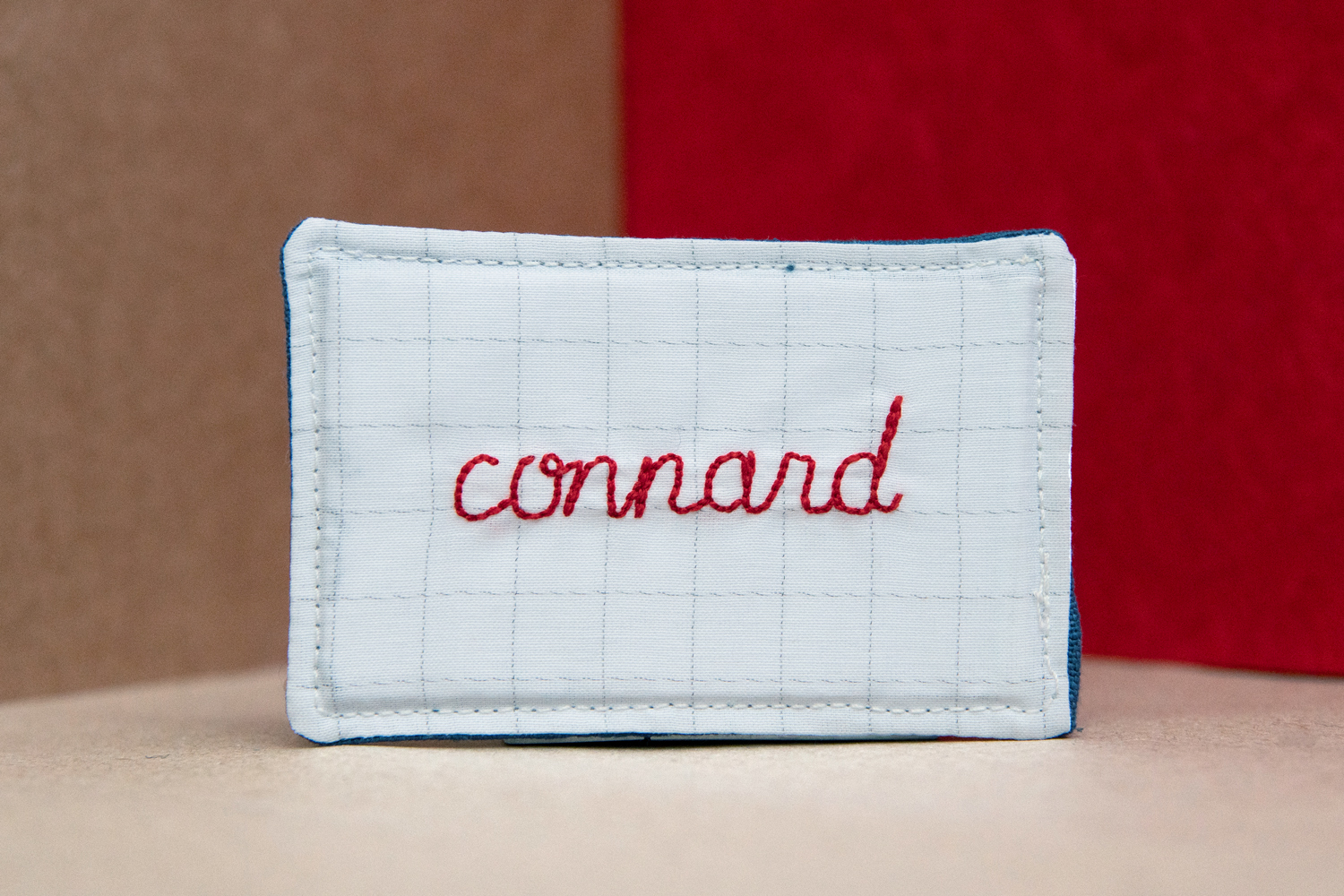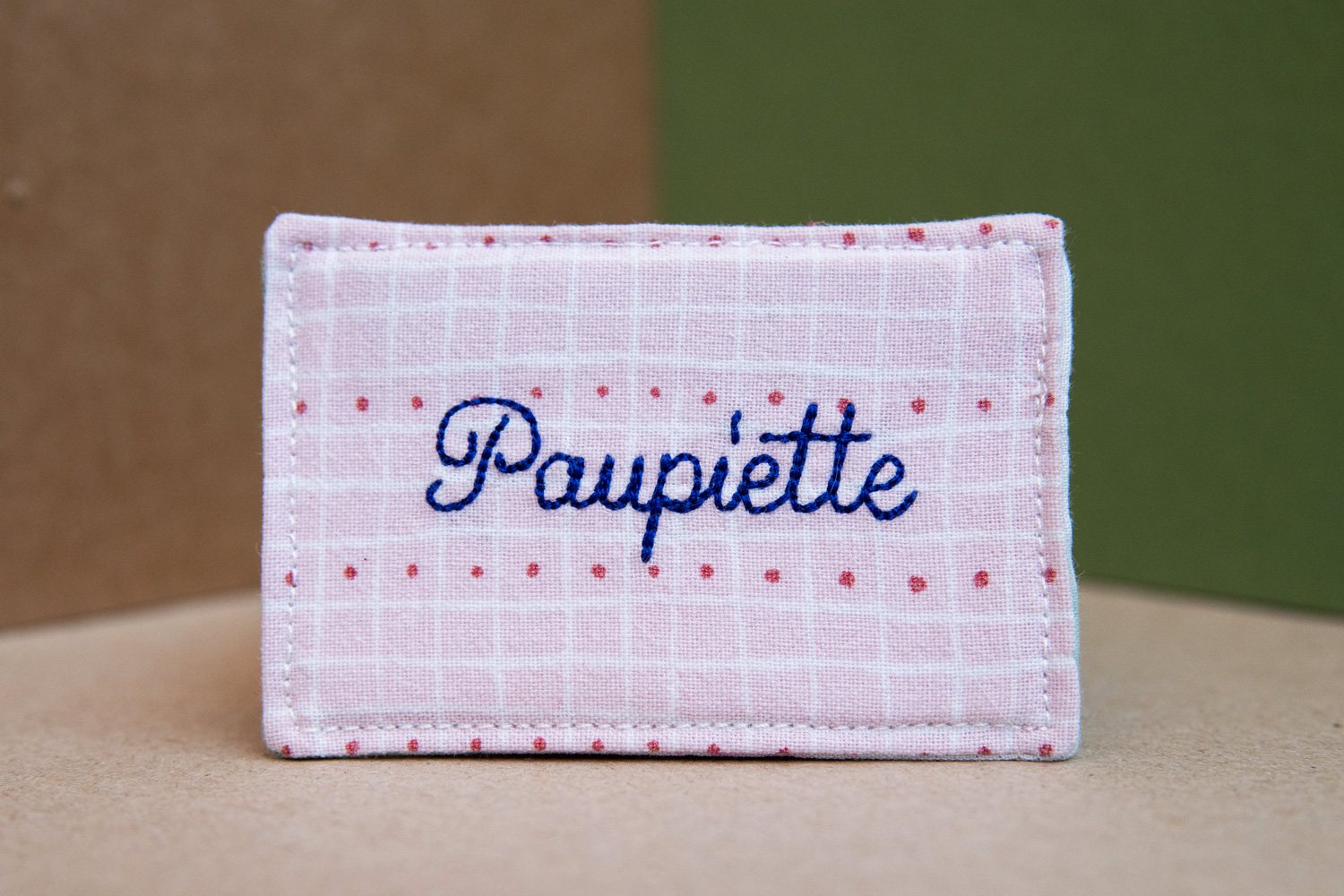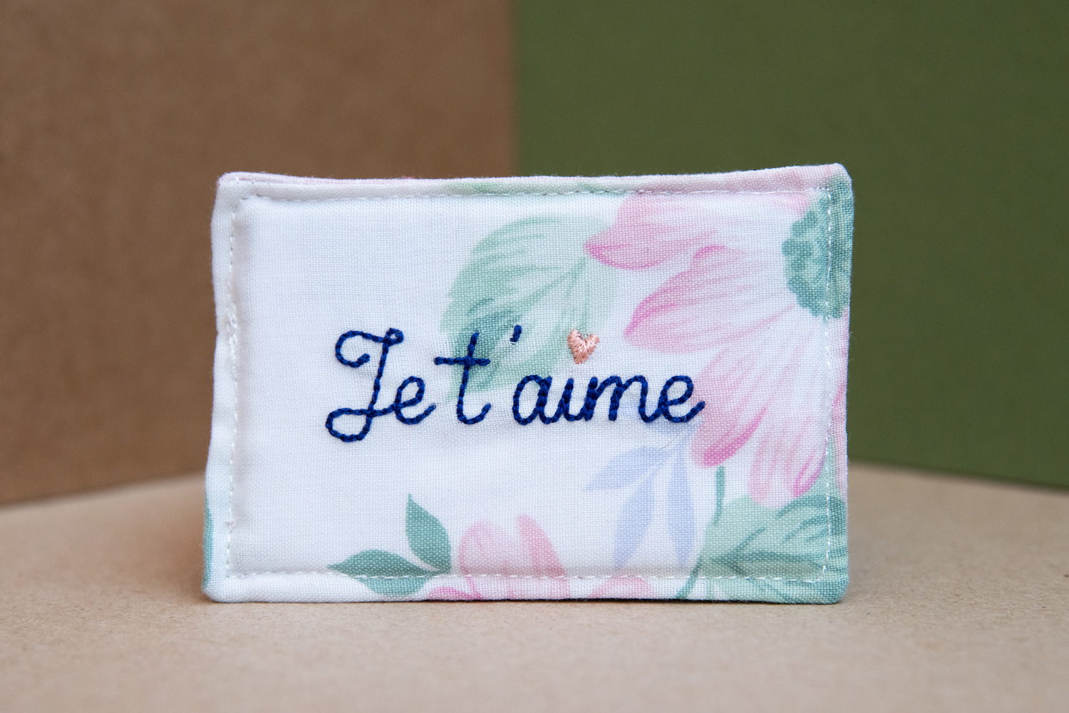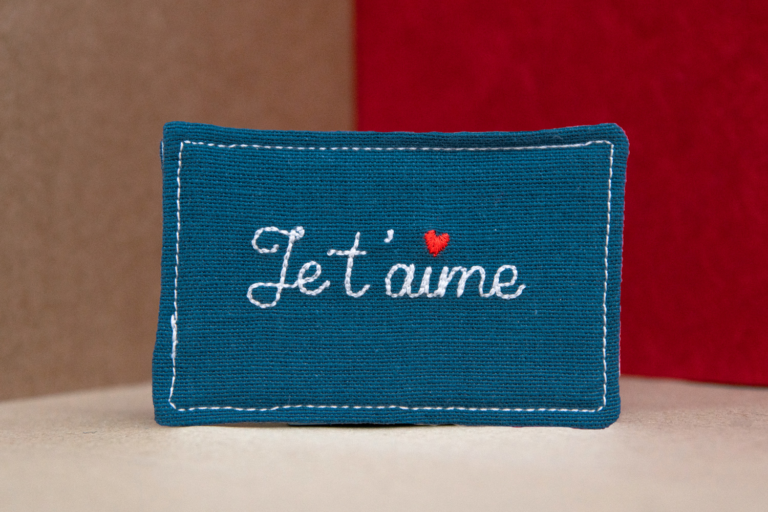 Entièrement fabriquées à partir de chutes de tissus ou de tissus upcyclés, ce sont des petites cartes (format 9cm x 6cm) confectionnées en pièce unique ou en micro-séries selon la quantité de tissu récupéré. Les messages brodés se répondent entre le recto et le verso. Elles sont toutes uniques/différentes et assemblées à la main avec amour ♥