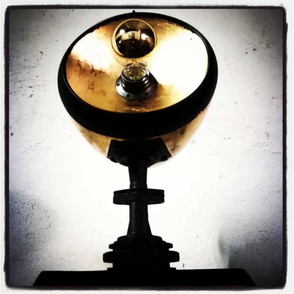 Phare de véhicule ancien doré à la feuille, sur trépied métal.