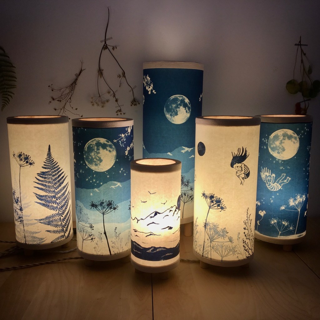 Les motifs, inspirés des soirées d’été, de la nature et de l’enfance, sont des impressions artisanales, toutes uniques (linogravure ou cyanotype).