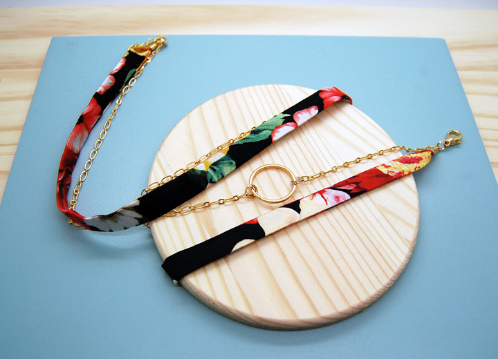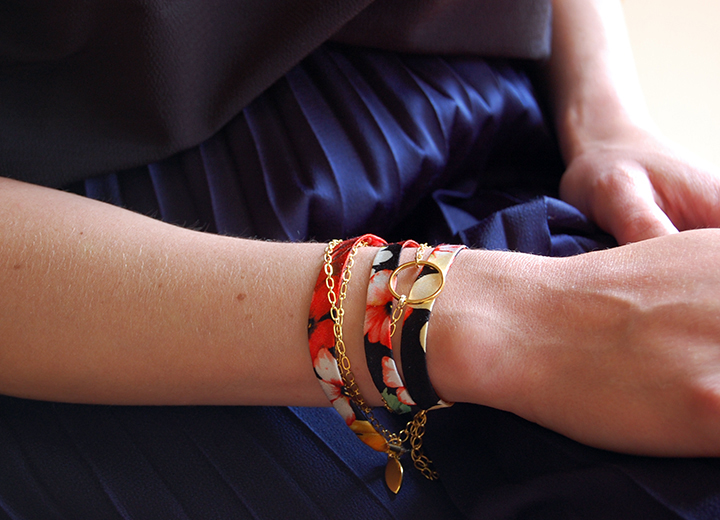 Bracelet Léonard soie fleurie et or modulable L’Orangerie Bijoux- Bijou modulable, soie fleurie et or, chaines laiton doré à l’or fin 24 carats, bracelet 3 tours ou bijou de tête, – A porter soit en bracelet à enrouler autour du poignet, soit en bijou de tête, 57 cm de long, chaîne de réglage longueur 8 cm, réglable de 48 à 57 cm, fermoir mousqueton – Bracelet ou bijou de tête.
