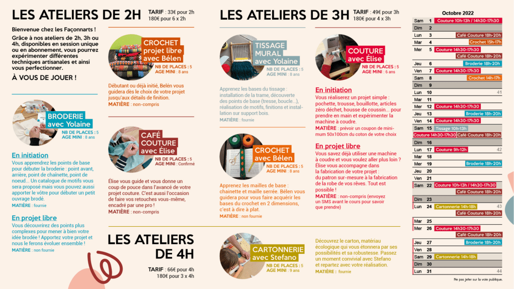 Les ateliers couture les cafés couture reprennent en Octobre ! Crochet, cartonnerie, broderie, et tissage sont toujours au programme !