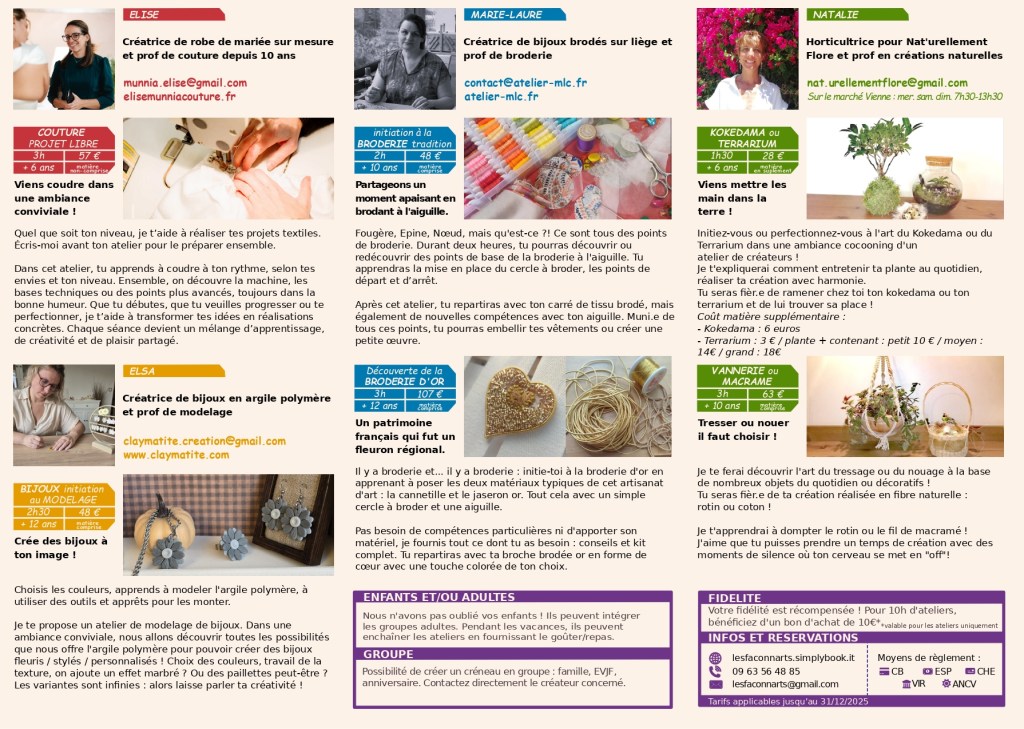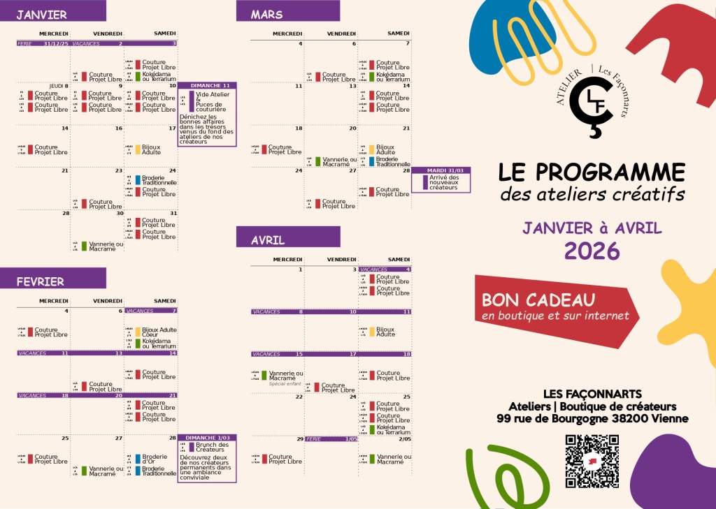Atelier Janvier-Avril 2026 Publié parlesfaconnarts3 janvier 2026Publié dansLES ATELIERSÉtiquettes :annee 2026, atelier, Atelier couture, atelier créatif, bijoux, boutiquevienne, broderie, createurvienne, DIY, kokedama, macrame, terrarium, vannerie, Vienne, vienne atout commerce, vienne38 Nous vous souhaitons une merveilleuse nouvelle année 2026, créative avant tout !!! Partager : Cliquer pour partager sur X(ouvre dans une nouvelle fenêtre) X Cliquez pour partager sur Facebook(ouvre dans une nouvelle fenêtre) Facebook J’aime chargement… Articles similaires