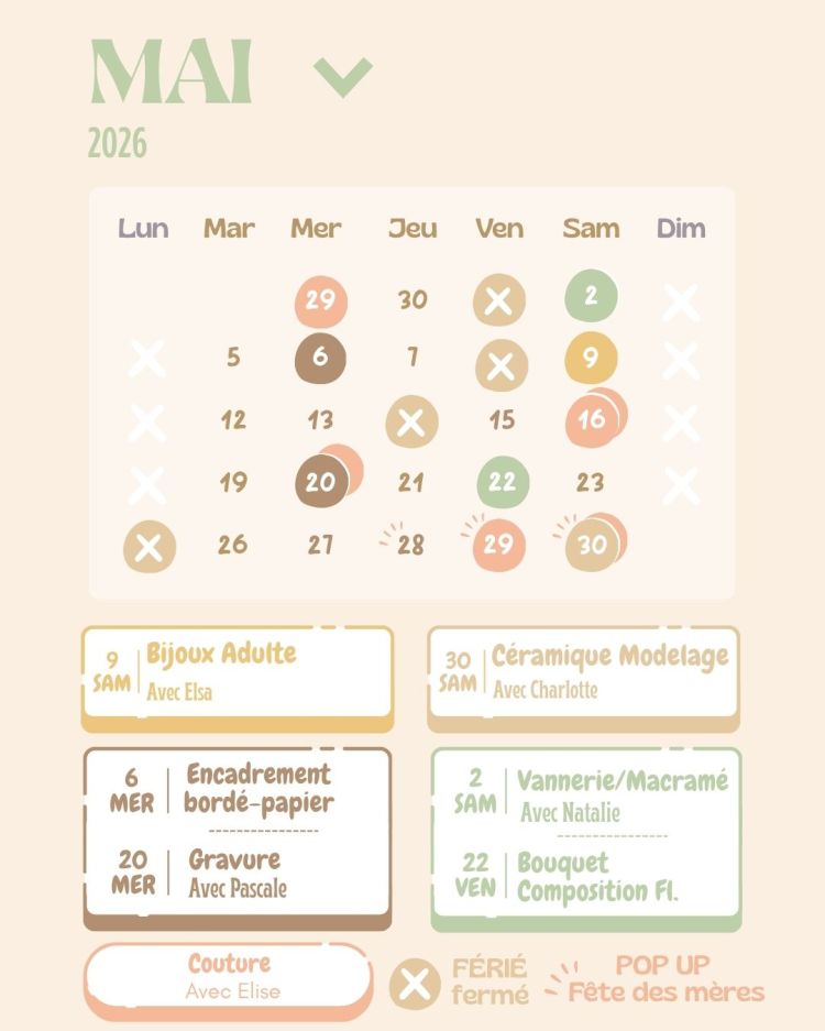 Les ateliers du mois de mai Publié parlesfaconnarts23 avril 2026Publié dansLES ATELIERSÉtiquettes :artisanat, atelier, boutiquevienne, createurvienne Partager : Partager sur X(ouvre dans une nouvelle fenêtre) X Partager sur Facebook(ouvre dans une nouvelle fenêtre) Facebook J’aime chargement… Articles similaires